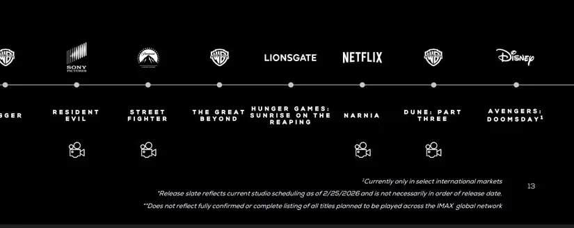 Secondo la presentazione agli investitori di IMAX, Avengers: Doomsday sarà proiettato solo nei cinema IMAX per mercati internazionali selezionati. Dune: Parte 3 sarà invece proiettato su tutti gli schermi IMAX negli Stati Uniti. Questo non è il caso di Avengers: Secret Wars l’anno successivo, poiché il sequel dell’MCU dovrebbe uscire in IMAX sia negli Stati Uniti che all’estero per la sua première il 17 dicembre 2027.