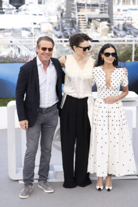 “È stato molto strano”, ha detto Moore vedendosi con le protesi sia sul set che alla prima proiezione di lunedì. Una cosa che mi ha aiutato è stata “il mio cane non mi ha riconosciuto. Era la mia pietra di paragone della realtà”, ha detto. Il cagnolino in questione è Pilaf, un cane da borsetta che ha rubato i cuori di tutto il mondo nelle ultime settimane, seduto in prima fila con Moore alla sfilata della collezione crociera Gucci e in posa per le foto sulla Croisette negli ultimi giorni.