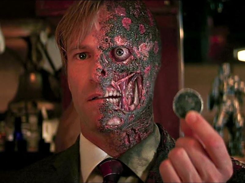 La tragica caduta di Harvey Dent (Aaron Eckhart) ne Il Cavaliere Oscuro lo lascia con cicatrici sia mentali che fisiche dopo il rapimento da parte del Joker (Heath Ledger) e la morte della sua fidanzata Rachel Dawes (Maggie Gylenhaal). Mentre Harvey riflette su quanto ha perso, chiede al commissario James Gordon (Gary Oldman) di rivelargli il soprannome che gli era stato dato agli Affari Interni, e Gordon risponde con riluttanza “Due Facce. Harvey Due Facce“. Le orribili ustioni sul lato sinistro del volto di Harvey vengono tenute nascoste fino alla fine, quando Harvey si rivolge finalmente alla telecamera per rivelare di essere diventato, letteralmente, Due Facce, in un’indimenticabile rivelazione del cattivo di Batman.